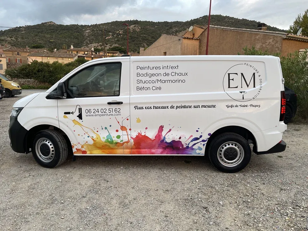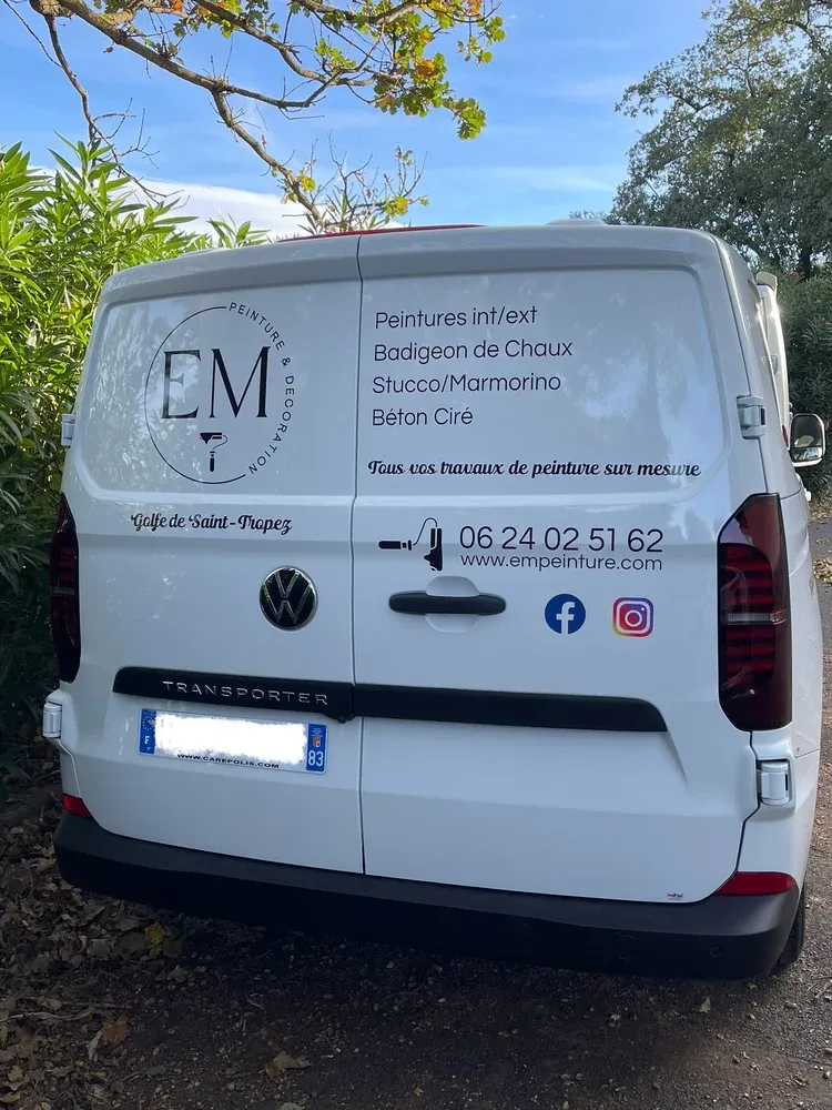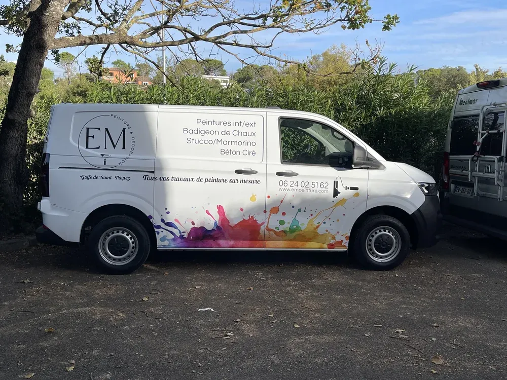 Chez EM Peinture & Décoration, nous sommes ravis d'annoncer l'arrivée de notre nouveau camion, une véritable œuvre d'art sur roues. Ce véhicule, décoré avec soin par David Defurne, arbore de jolies couleurs et met en avant notre logo de manière éclatante. Les clients de la région pourront le repérer de loin lorsqu'il circulera dans le Golfe de Saint-Tropez.